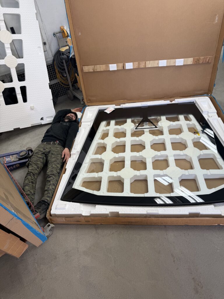 Quand l’un de nos techniciens a voulu montrer l’échelle réelle du verre. Il s’est simplement allongé à côté de la caisse… et on a réalisé à quel point ce pare-brise est immense.
